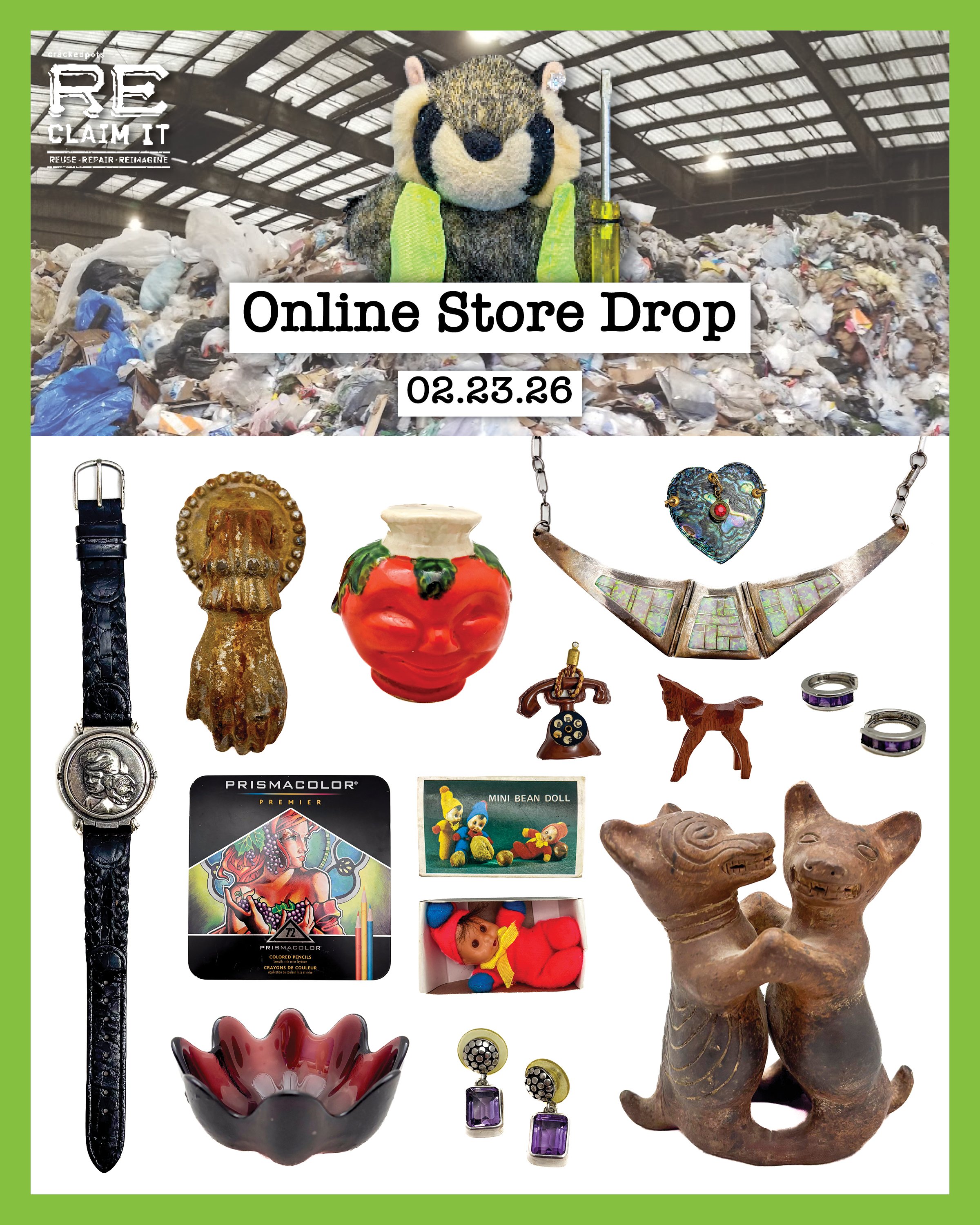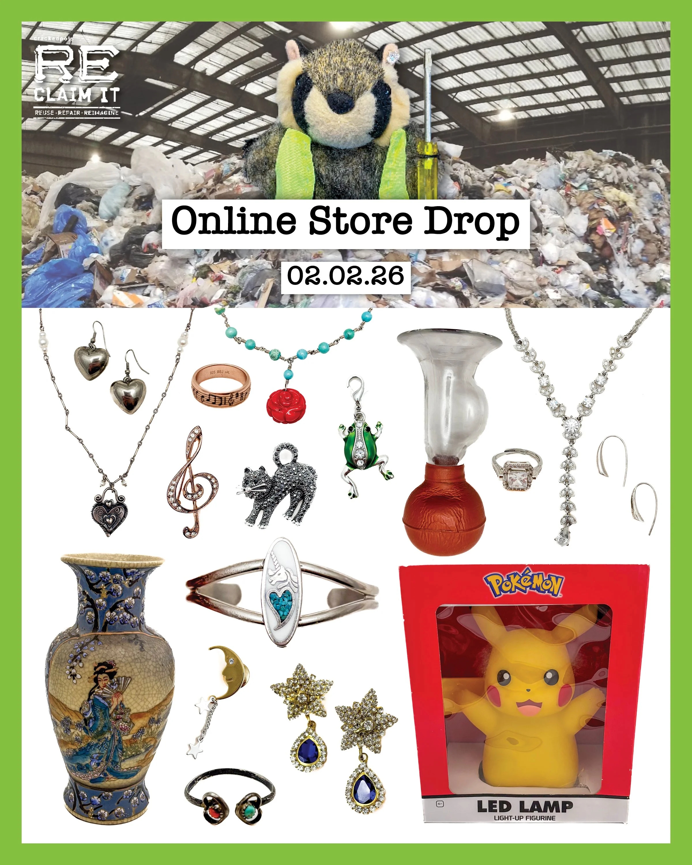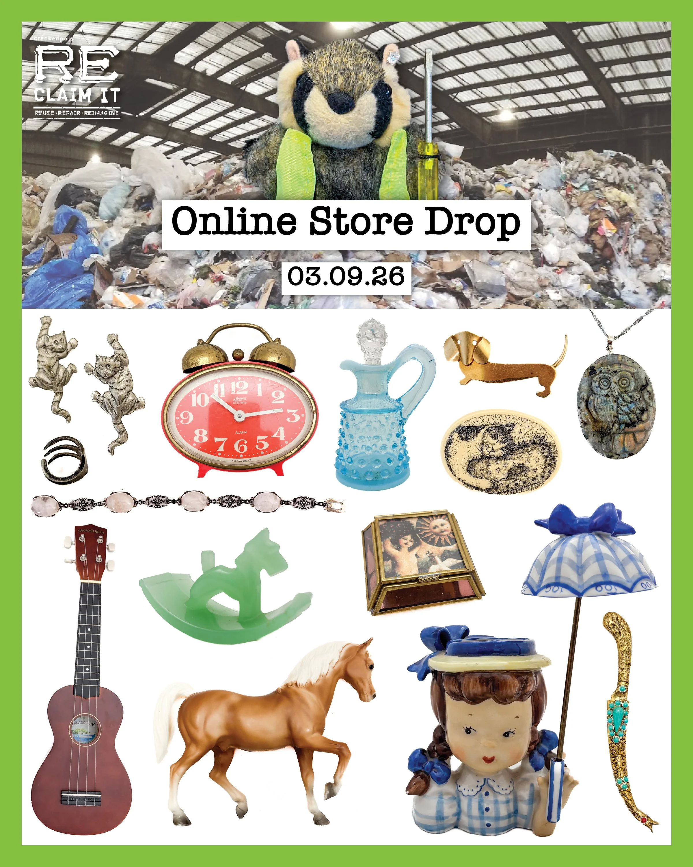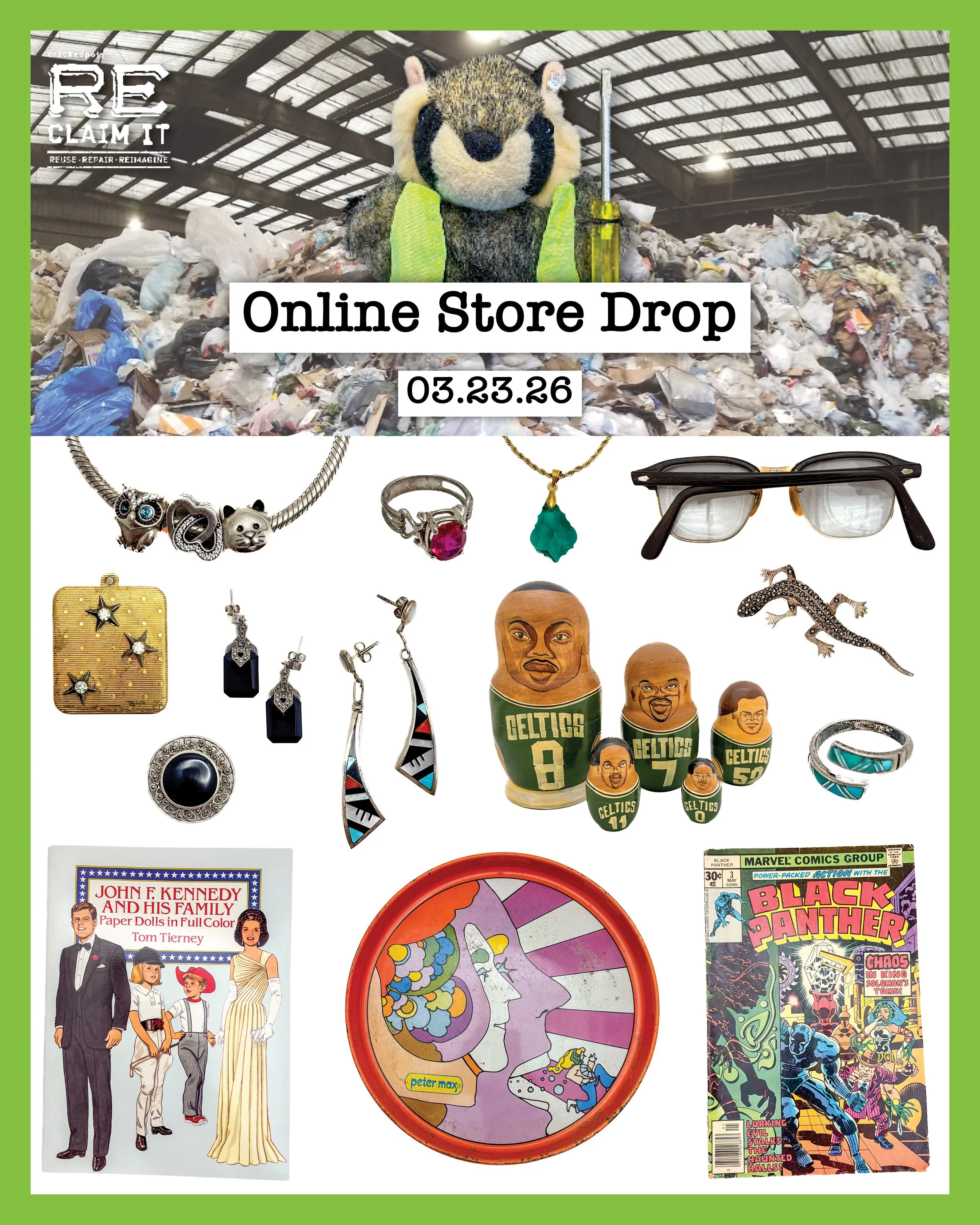 From jewelry to vintage trinkets to oddities... it's time to buy the latest treasures saved from the trash from the comfort of your home. Keep in mind these items are for pick up only.